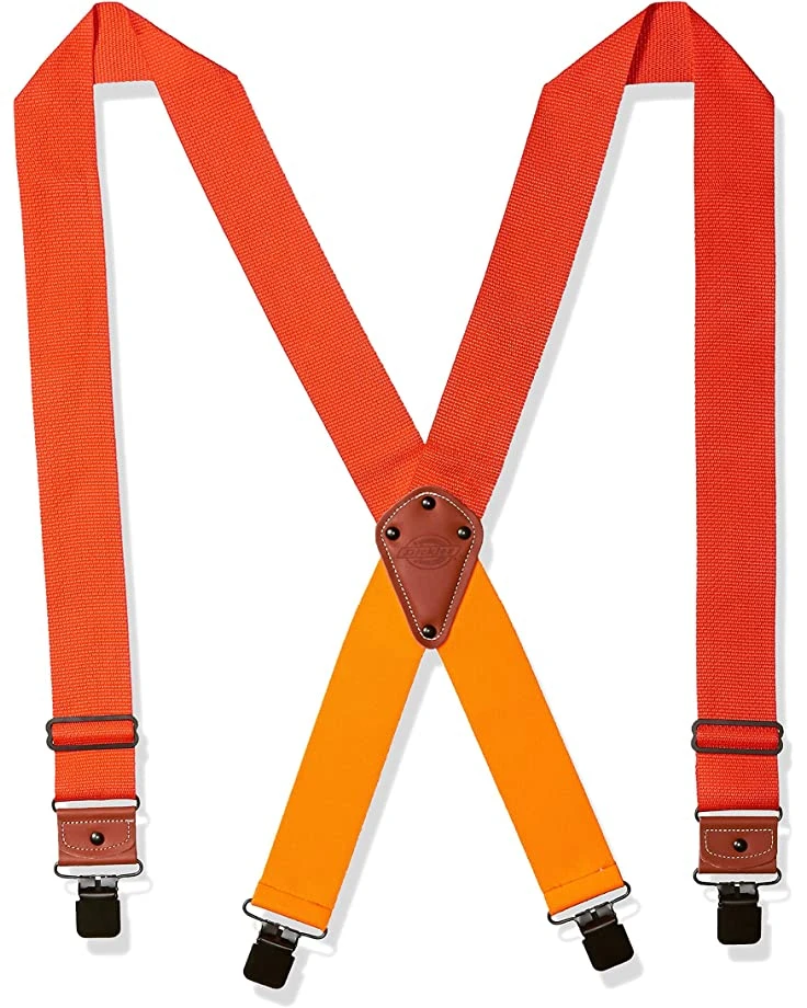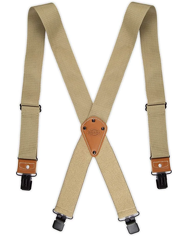 - . SUSPENDERS STYLE: X-back construction is the sturdiest construction for suspenders. Our Dickies suspenders are enhanced with sewn-in leather patch buttoned clip-on closure to offer you a better holding experience.