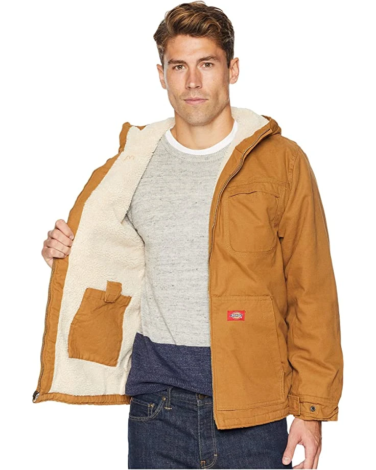 - Bring classic good looks to your everyday style with the rugged durability and lightweight warmth of the Dickies® Sanded Duck Sherpa Lined Hooded Jacket.