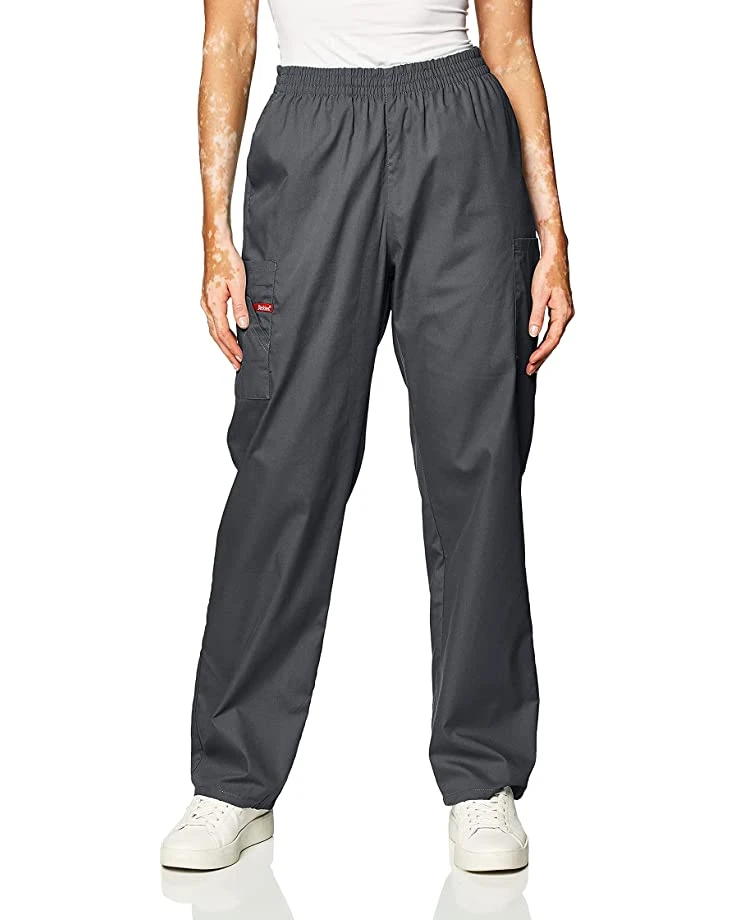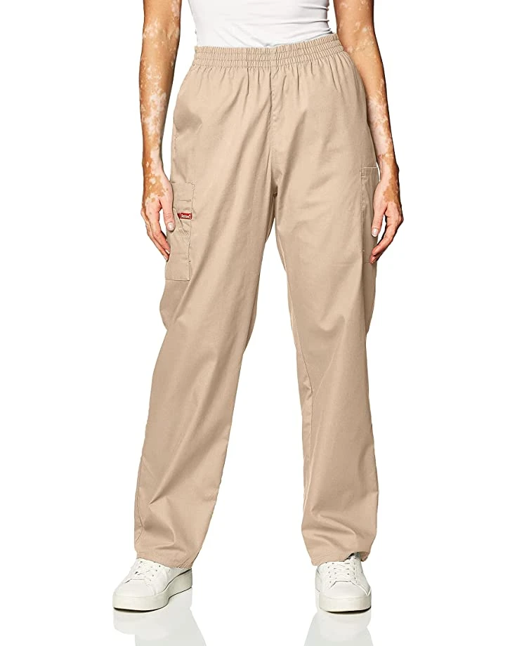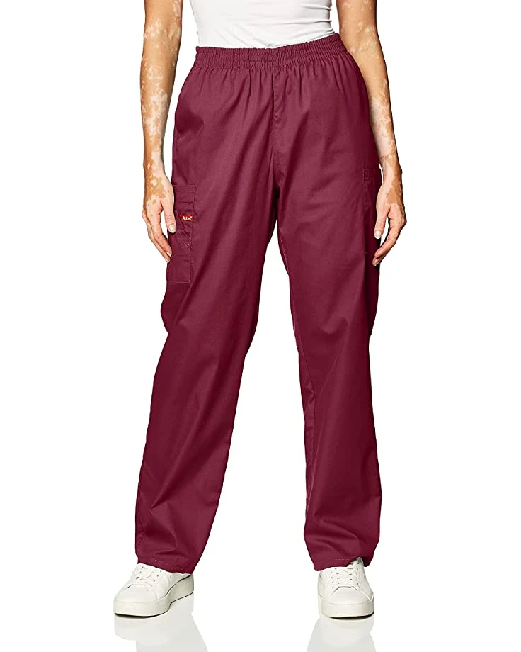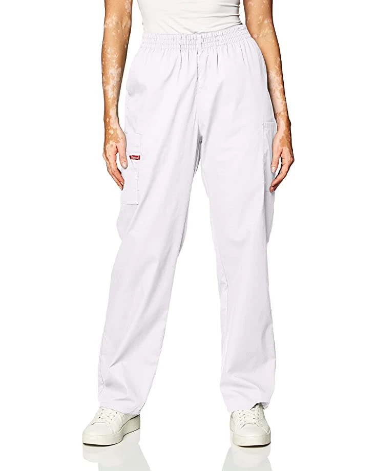 - A missy fit, natural rise, tapered leg, pull-on pant features an all-around elastic waistband with Dickies logo twill tape on the inside back waistband and as an instrument loop on the right cargo pocket. Also featured are slash pockets and cargo pockets with a stretchy red knit interior pocket (white knit pocket on white).