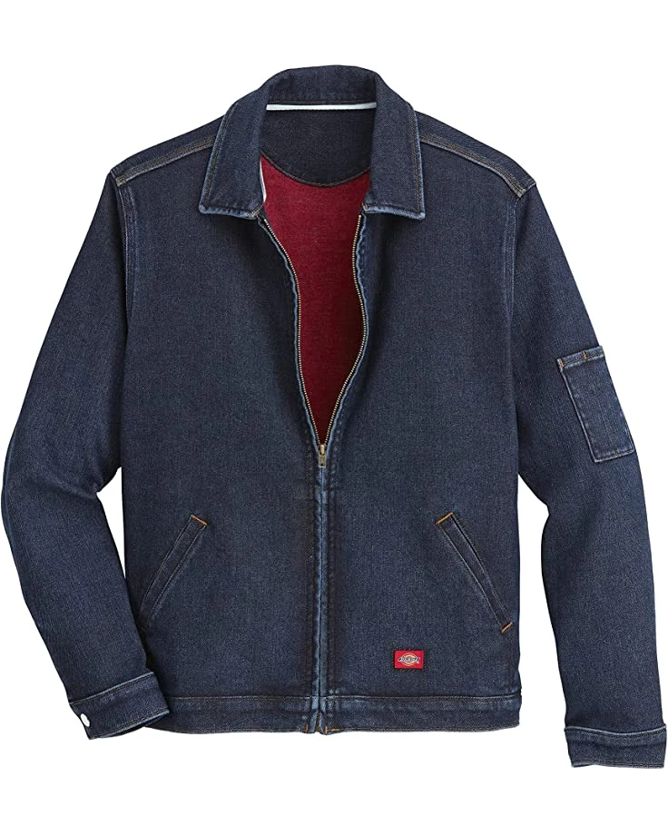I have been wearing Dickies since very early 90’s and have not been this hyped about a garment since they came out with ‘girl’s’ cut/capris. Long time ago! This jacket is so comfortable, I wear it at home instead of a sweater if it’s a little chilly. It’s light and not too hot, but somehow keeps me really warm also. I love jean jackets, but they never have enough ‘give’ in the shoulders when I’m trying to move. I am seriously considering buying a second one because I want one for work I can get hair color and bleach on! I bought a Large and I’m 5’3″.